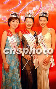 ![]() 二00二年度香港小姐競選冠、亞、季軍,8月12日亮麗登場領獎會見新聞界,(左起)季軍胡家惠、冠軍林敏俐、亞軍左慧琪。洪少葵 攝