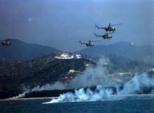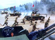 解放軍東海聯合演練 高科技與實戰(zhàn)融為一體(圖) 2002年08月19日 08:32 ![]() 步坦協同,席卷敵陣 ![]() 戰(zhàn)鷹突破空中防線 ![]() 獵潛艇劈波斬浪 ![]() 直升機臨空支援 中新網北京8月19日消息:中國官方媒體人民網昨晚發(fā)表解放軍在東海演習的照片,從照片中可以看到演習動用了坦克、軍艦、戰(zhàn)機和直升機。 據人民網報道,東海某海域進行三軍聯合作戰(zhàn)演習的南京軍區(qū)隊及配屬的?哲婈牐熏F代高科技與未來實戰(zhàn)需要融為一體,為全面掌握現代戰(zhàn)爭的特點和主動權﹑制勝權。 報道指,三軍將士以飽滿的熱情真打真練,能謀善戰(zhàn),斗志高昂,樹立了敢打必勝的信心。