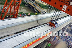 五日,隨著第2550根預(yù)應(yīng)力混凝土軌道梁穩(wěn)穩(wěn)地架設(shè)在磁懸浮工程的蓋梁上,上海磁懸浮工程實(shí)現(xiàn)了軌道梁全線(xiàn)貫通。圖為第2550根軌道梁架設(shè)成功。湯彥俊 攝
