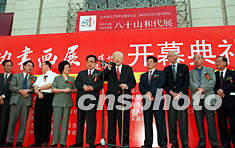 為慶祝北京師范大學百年校慶,“啟功書畫展”六日在中國革命博物館舉辦。啟功先生(左六)、前人大常委會委員長喬石(左五)和中央統戰部部長王兆國(右四)參加了開幕式。作者:張勤