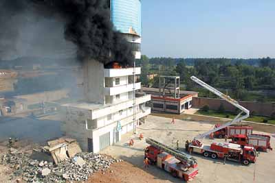 “砰!”5顆紅色信號彈躥上天空,9層高的大樓內(nèi)隨之發(fā)出一聲巨響,大樓北側的兩層附樓轟然倒塌,一股濃煙夾雜著火焰從5樓窗口躥出。大樓內(nèi)的人們紛紛跑到窗邊呼救。