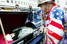 一名美國人制作了一具裝有本·拉登“尸體”的棺木,十一日在紐約世貿中心前的百老匯大街上示眾,以此紀念“9.11”事件一周年。作者:王瑤