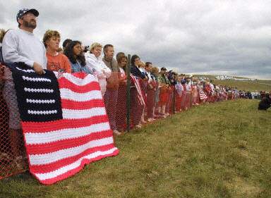 在匹茨堡東南70英里的阿帕拉奇安高低的這片露天礦上,聚集了數(shù)千名民眾,包括500多名遇難者的家屬。他們很多人飽含熱淚,在陰沉的天空下緊握著美國國旗。當(dāng)?shù)貢r間上午10:00,正是一年前那架波音757客機(jī)以大約500英里的時速墜毀在這片空地上。當(dāng)被美國總統(tǒng)布什譽為英雄的33名遇難乘客和7名殉職的機(jī)組人員名單被宣讀時,一座百年歷史的教會鐘悠然響起。