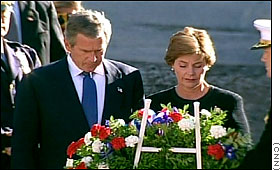 布什的直升機(jī)于美國(guó)東部時(shí)間下午4:45左右降落在紐約市。總統(tǒng)車隊(duì)隨即護(hù)送他前往世貿(mào)中心廢墟遺址,出席敬獻(xiàn)花圈儀式。