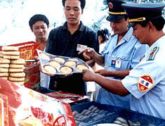 中秋節(jié)前夕,山東棗莊的工商人員在集市上檢查月餅質(zhì)量,以保證消費者在中秋節(jié)吃到質(zhì)量信得過的月餅。 作者:高貴軍