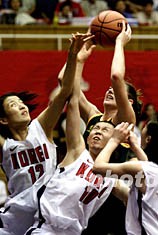 三名韓國球員(白色球衣)阻擋澳大利亞十一號杰克遜(綠色球衣)投籃。在二十五日進行的十四屆女籃錦標賽三四名決賽上,澳大利亞戰勝韓國奪得季軍,杰克遜一人獨得三十二分。作者:鄭萍萍