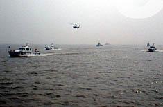 上午九時整,隨著三顆紅色信號在該水域騰空而起,一場中國規模最大的海上搜救演習--二○○二年海上搜救、反恐怖、溢油應急綜合演習由此拉開帷幕。