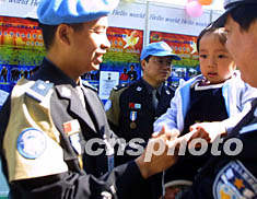 北京市公安局出入境管理處警察,六日佩戴著聯合國維和警察標志,在公園向市民展示中國警察在聯合國維和行動中的地位,以增強老百姓的自豪感。作者:宋吉河