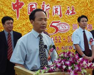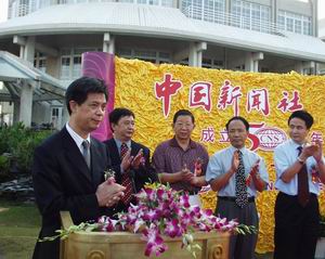 中新社總編輯郭招金在慶典上致辭。他說,中新社是中國兩家通訊社之一,成立于一九五二年九月十四日,主要為港澳同胞、臺灣同胞、華人華僑服務(wù)。目前,中新社在中國內(nèi)地的二十五個省、自治區(qū)、直轄市設(shè)有五十六個分社、支社、記者站。在香港、澳門特別行政區(qū),在美國、澳大利亞、日本、法國、泰國建有分支機構(gòu)。現(xiàn)在中新社每天播發(fā)新聞電訊稿一百余條,傳真圖片三十多張,中國新聞網(wǎng)每天更新新聞四五百條,中國新聞圖片網(wǎng)每天更新新聞圖片一百多幅,向海外幾十家報紙?zhí)峁⿲8搴椭谱魇邆報紙版面。