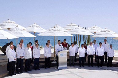 記者看到,上午八時半左右,墨西哥總統福克斯即在會場外一一迎候與會者。九時許,按APEC傳統,與會領導人和代表著東道主提供的特色民族服裝拍攝“全家福”。與上屆上海峰會的中式唐裝相比,今天的“瓜亞貝拉”同樣極有“個性”,它是墨西哥東南部流行的一種傳統服裝,為精一色的白色,有四個胸袋。合照背景為太平洋碧藍的大海,藍白相襯,在美麗的洛斯卡沃斯留下了一道亮麗的風景線。