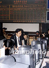 上海黃金交易所三十日正式開業,標志著中國長達半個世紀的黃金管制徹底結束,亦表明中國由貨幣市場、證券市場、保險市場、外匯市場和黃金市場所組成的主要金融產品交易市場全部建成。圖為上海黃金交易所交易大廳。作者:姜煜