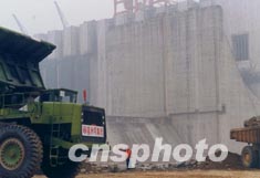 江水奔騰,浪花飛卷。導(dǎo)流明渠右岸數(shù)百臺大型運(yùn)載車,不斷地將一車車石料傾人江中。