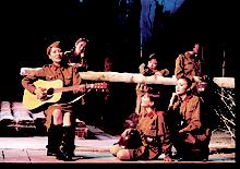 導(dǎo)演將這出戲定位為“詩(shī)化現(xiàn)實(shí)主義戰(zhàn)爭(zhēng)劇”,并用觀賞性很強(qiáng)的俄羅斯歌舞來調(diào)劑原本凝重慘烈的氣氛。既有表現(xiàn)女兵青春形象的歡快的歌曲,也有烘托戰(zhàn)爭(zhēng)殘酷的悲傷曲調(diào),更有象征俄羅斯精神的激昂旋律。