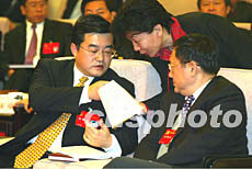 中國共產黨第十六次全國代表大會九日繼續就江澤民總書記的報告進行分組討論。圖為中國航天科技集團公司總經理張慶偉代表(左一)在會上發言。 作者:毛建軍
