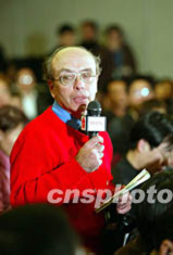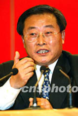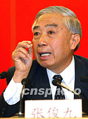 中華全國總工會副主席張俊九和中國社會勞動保障部部長張左已十一日在中共十六大新聞中心舉行新聞發布會。張俊九回答記者提問。毛建軍 攝