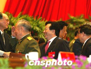 曾慶紅與遲浩田、李長春出席十四日在北京閉幕的中共十六大,與主席團成員握手言歡。