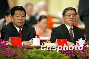 賈慶林和黃菊十四日在北京出席中共十六大的閉幕會。作者:毛建軍