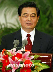 圖為胡錦濤總書記向中外記者介紹新當選的常委們。