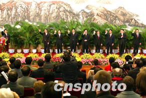 中國共產黨十六屆一中全會十五日上午在北京人民大會堂舉行,胡錦濤、吳邦國、溫家寶、賈慶林、曾慶紅、黃菊、吳官正、李長春、羅干等九人當選為新一屆中共中央政治局常委。作者:毛建軍