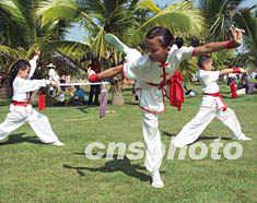海南島海口市的青少年業余武術訓練中心的小朋友表演武術,為中共十六大閉幕起舞助興。作者:王辛莉