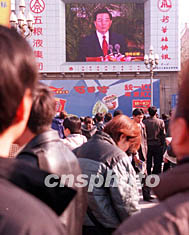 十一月十五日,新一屆中共中央政治局常委通過電視直播與民眾見面。北京火車站廣場的大屏幕前站滿了觀看直播的市民,胡錦濤出任總書記成為關注焦點。作者:張宇