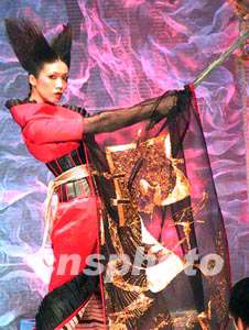 二十六日晚,薄濤制衣2003高級時裝發布會在北京舉行,服裝師的設計大膽新奇,以模特舞劍出場展示服裝。作者:盛佳鵬