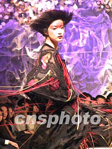 二十六日晚,薄濤制衣2003高級時裝發布會在北京舉行,設計師在服裝設計上融合古今,并加以大膽的想象,造就了其服裝的鮮明個性。作者:盛佳鵬