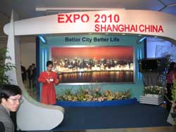 在中國的展臺,外層設有照相機鏡框形狀的白色門框,蘊涵“聚焦”之意。在門框上,還做成了一個激光豎琴,手指撥動激光束便能聽到動聽的旋律。今天一位中國姑娘將在這里演奏中國申博宣傳片的主題曲———《好一朵美麗的茉莉花》。