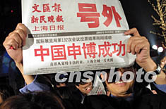 三日晚,在摩納哥夢特卡洛舉行的國際展覽局第132次會議上,中國上海通過激烈竟爭獲得2010年世界博覽會主辦權,當中國申博成功的喜訊從蒙特卡洛傳來的時候,上海全城沉浸在一片歡樂之中。圖為申城市民在為中國申博成功歡呼。作者:湯彥俊