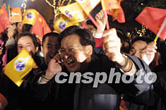 三日晚,當中國上海申博成功的喜訊從蒙特卡洛傳來的時候,上海全城沉浸在一片歡樂之中。圖為申城市民在慶祝中國申博成功。作者:湯彥俊