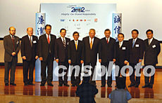 董建華與香港商政領(lǐng)袖簽署誠信協(xié)議。二零零二年領(lǐng)導論壇“商政領(lǐng)袖面對的誠信挑戰(zhàn)”十二月十二日在香港舉行,香港特區(qū)行政長官董建華(右五)、公務員事務局局長王永平(左五)及廉政專員李少光(右四)等在該論壇上簽署誠信協(xié)議。潘索菲 攝