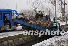 十五日,北京迎來了今冬第一場雪。在朝陽區金盞鄉路口,由于路面濕滑,一輛載豬卡車撞向路邊深溝,幸好沒有人員傷亡。作者:趙振清