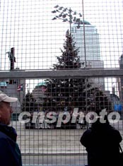 圣誕之際,美國在紐約世貿廢墟上矗立起高大的圣誕樹,寄托對二千多個無辜生命的悼念之情。作者:趙海燕