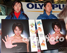 香港歌星梁詠琪今年在北京成為奧林巴斯商家代言人。二十九日,兩位北京小姐在翠微商廈手捧梁詠琪的兩幅細微差異肖像請顧客辨認,優勝者可以獲獎。作者:鄒憲