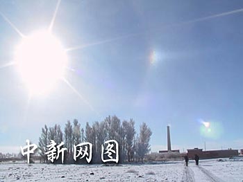 中國酒泉衛(wèi)星發(fā)射中心上空日前出現(xiàn)難得一見的日暈現(xiàn)象——天空同時出現(xiàn)一大兩小三個太陽。中新社記者 孫自法 攝