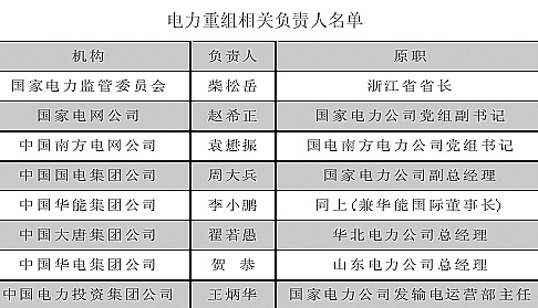 新成立的電力公司包括:國家電網公司和中國南方電網有限公司,以及中國華能集團公司、中國大唐集團公司、中國華電集團公司、中國國電集團公司、中國電力投資集團公司等五家發電公司,和公司中國電力工程顧問集團公司、中國水電工程顧問集團公司、中國水利水電建設集團公司和中國葛洲壩集團公司等四家輔業公司。