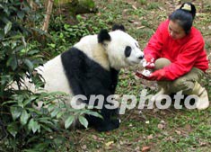 圖為飼養(yǎng)員為"青青"喂賀歲蛋糕。