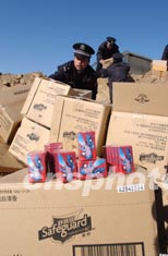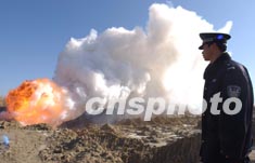 一月三日,北京警方將近期內收繳的非法販賣者私自販運的煙花爆竹進行統一銷毀。作者:李連杰