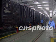一月七日粵海鐵路火車輪渡將正式開通,今天在最后的試運行中,鐵道部領導親自見證了火車開進粵海鐵巨大的船艙。關向東 攝