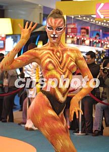 七日在上海國(guó)際會(huì)議中心舉行的柯達(dá)嘉年華會(huì)上,主辦商請(qǐng)來(lái)模特現(xiàn)場(chǎng)表演人體彩繪,為盛會(huì)助陣。作者:湯彥俊