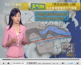 長達6分多鐘的日全食奇景22日上午8時左右出現在大陸長江流域一帶,臺灣地區全程可見日偏食,食分高達0.85~0.75,是近年來食分最大的一次日偏食,太陽被月亮遮蔽面積最大時的“食甚”,太陽將如一彎眉月般,非常特殊。