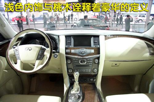 在來到英菲尼迪QX56內(nèi)室前,我就已經(jīng)想到了它會(huì)非常豪華,而眼前所看到的與先前的想法很一致。如果將內(nèi)室的圖片先行解析,我們很難想到這是一款SUV車型,而它更像是一款豪華轎車。內(nèi)飾全部由米色的真皮與桃木充斥著,溫暖與豪華也是QX56所想要的。白色的刻度、指針與藍(lán)色的裝飾背光組合的儀表盤,給略帶中庸的內(nèi)飾增添了一分時(shí)尚感。