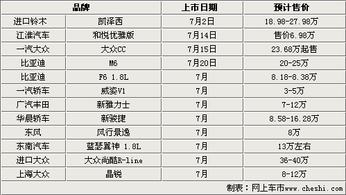 7月份上市的新車型中聚集了眾多知名大品牌。譬如一汽大眾、進口大眾、廣汽豐田等。而按照車型細分,其中涵蓋小型車、緊湊級車、以及中級車備受關注的SUV車型等,其中自足品牌占據了一半,達到了6款車型,分別是江淮和悅優雅版比亞迪M6和F6 1.8;威姿V1;新駿捷;風行景逸,合資車型一汽大眾CC;新雅力士;三菱翼神;晶銳,進口車型鈴木凱澤西;尚酷R-line,共計12款車型。