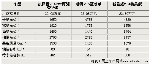 進口鈴木凱澤西于7月2日正式上市銷售,本次上市的凱澤西共推出6款新車,售價區(qū)間18.98-27.48萬元。凱澤西是鈴木汽車旗下的旗艦運動型轎車,以上市后的報價來看,這個價格區(qū)間將對一些同價位的車型造成不小的影響。雖然同為20萬左右,但是純進口車型相比國產(chǎn)車型還是有一定優(yōu)勢的。今天我們從凱澤西、馬自達6睿翼和新君威當中挑選出三款款價格十分接近的車型,凱澤西2.4L兩驅豪華版、睿翼2.5L至尊版和新君威2.4L精英型,售價同為22.98萬左右的它們,在配置方面如何呢?接下來為您揭曉。