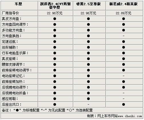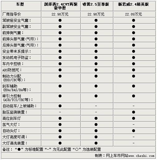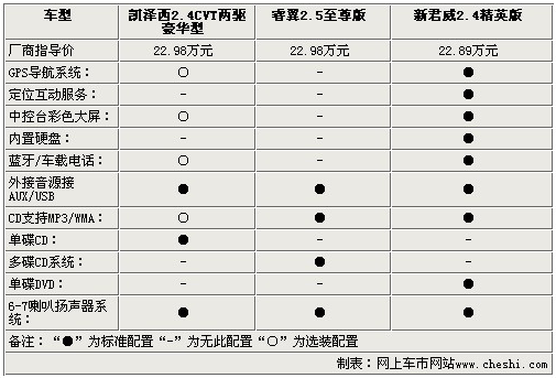 影音系統(tǒng)方面,三款車都為使用者提供了多揚聲器的配置,除了AUX/USB接口外,凱澤西還配備了單碟CD,而睿翼則配備了更為便利的6碟CD系統(tǒng),新君威為單碟DVD。通過以上參數(shù)配置方面的比較,對于三款22.98萬左右的中級車,配置方面基本打成平手,僅在一些細節(jié)方面有所出入,不過動力方面凱澤西確是實實在在的戰(zhàn)勝了睿翼和新君威,幾乎將2.4L引擎的動力發(fā)揮到了極致。