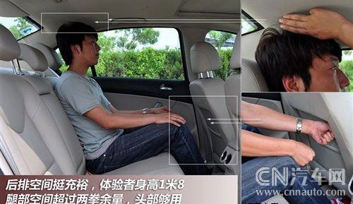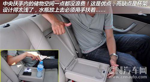 由于標致408的軸距達到了2710mm,因此其后排擁有很寬松的乘坐空間。從上圖可以看到,體驗者腿部前方將近兩拳半的活動空間,可讓乘坐者任意擺出最舒適的姿勢。寬厚的后排座椅可為乘客提供舒適的駕乘感受,另外,在后排中央扶手箱內還設置有一個內藏式儲物格,可以放置一些體積不是很大的物品。