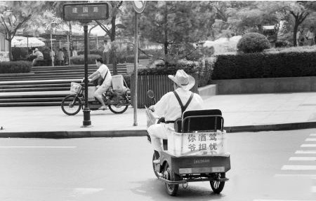 7月11日晚上9時許,西部網網友“拍得樂”將自己白天逛街時拍攝的5張照片傳到網上,照片的主角是一位胡子花白的老大爺,白襯衣、背帶褲、牛仔帽、墨鏡,老大爺十足的潮人打扮(如圖)。讓網友感興趣的是,老大爺騎的電動三輪車上貼著搞笑的標語——你酒駕,爺擔憂。
