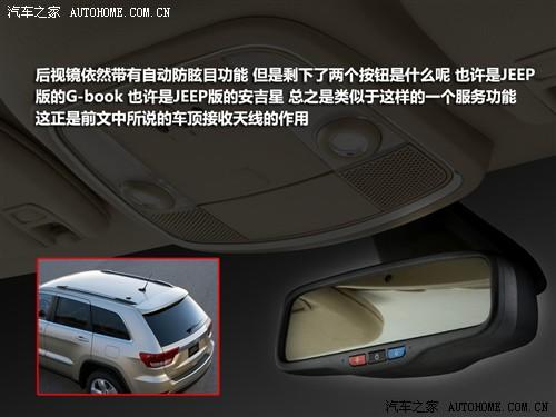 車內反光鏡上有三個按鈕,中間的為自動防眩目的開關,那另外兩個是什么呢,或許是JEEP的“G-book”,或許是JEEP的“安吉星”,總之我們猜測就是類似于這兩個系統的一種服務功能,而上文提到的車頂天線應該就是該系統的接收模塊吧。