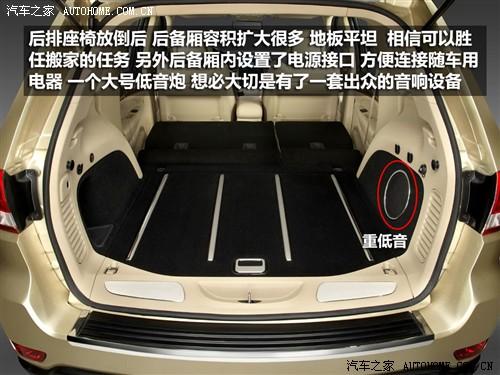 座椅放倒后空間后備廂空間得到很大擴大,放倒后地板平整,我想可以勝任搬家的任務,如果用作旅行,后備廂容積足以放下你所需的物品,不是還有車頂行李架呢嘛?后備廂還這是了一個電源接口,方便隨車用電器連接使用。另外在后備廂內發(fā)現了一個尺寸不小的低音炮,相信新款大切可以給我們帶來不錯的視聽感受。