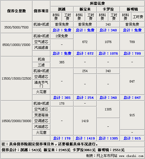 別克新凱越首保時間是四款車型中最短的,但廠家提供前兩次免費保養(yǎng),這點看來還比較貼心。18500公里結算后,543元的總保養(yǎng)金額是四款車中最少的一個。新寶來和新明銳同為大眾品牌下車型,但由于合作商不同,保養(yǎng)的費用還是存在一些細微的差距,都在2600元范圍內。日系車一貫是經濟實惠見長,但在后期保養(yǎng)的方面豐田卡羅拉的費用卻是四款車中最高的,超過3000元的數(shù)字也是新凱越保養(yǎng)費用的5倍多。